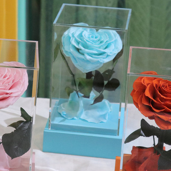 8-9cm दिल के आकार छोटे राजकुमार सजावटी गुलाब अनन्त वेलेंटाइन के लिए हमेशा के लिए एकल में संरक्षित फूल एक्रिलिक बॉक्स उपहार