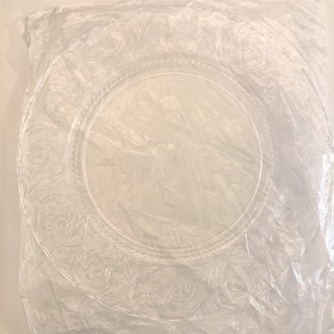 Piring pengisi daya plastik, pelat pengisi daya plastik piring kaca dekorasi kerajinan cap emas pesta pernikahan transparan